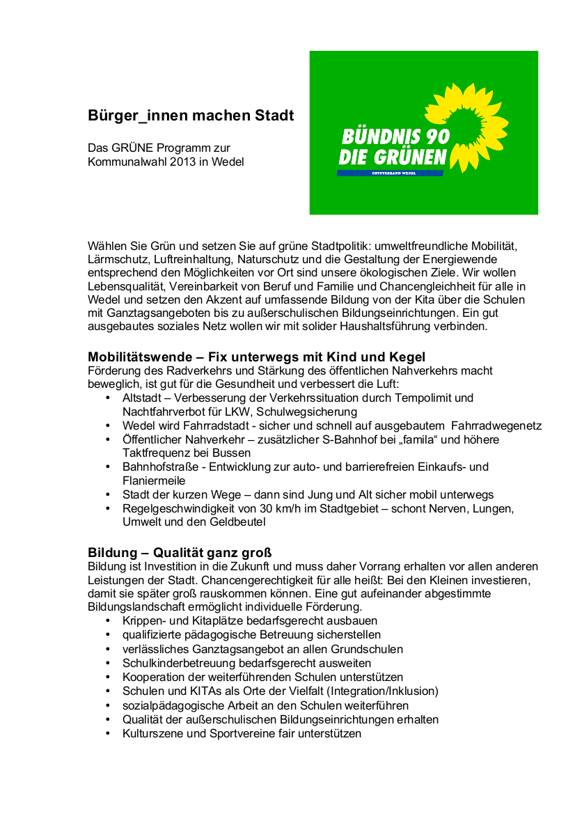 Wahlprogramm von Bündnis 90 / Die Grünen - OV Wedel zur Kommunalwahl 2013